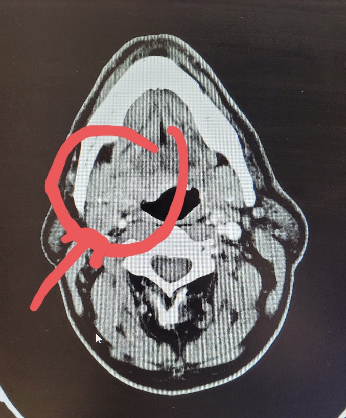 Fig.1 Se observa pe imagine Computer Tomograf cu substanta de contrast, secțiune axiala, formatiunea tumorala (incercuita) si un ganglion sugestiv metastatic jugulo-carotidian superior drept (indicat de sageata).