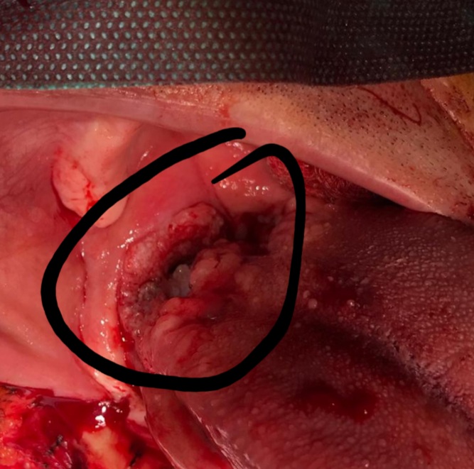 abordul este extrem de dificil necesitand despicarea buzei inferioare si a osului mandibular pentru acces
