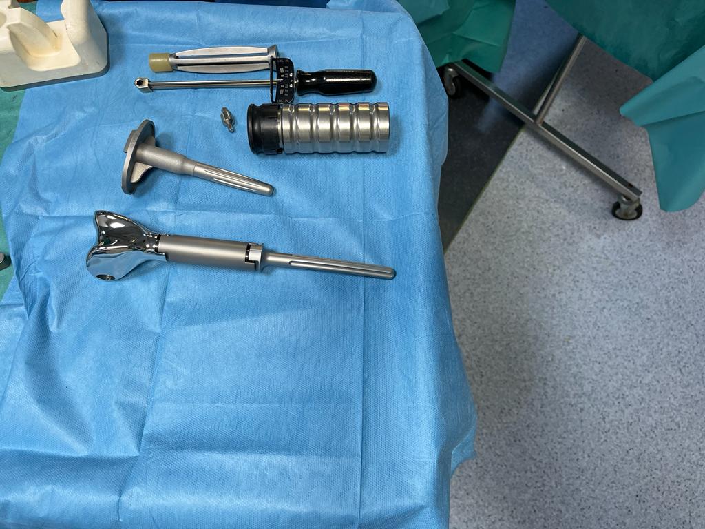 "Defectul osos mare de la nivelul femurului distal impun o reconstructie a genunchiului cu endoproteza segmentara pentru defect femural mare pe care impreuna cu echipa mea (dr. COSTE REMUS, dr. DRAGHICIOIU HOREA, dr. MUBARAK FADOL, as. GAVRA MONICA) am efectuat-o in luna iunie 2022. Lipsa mare de os de la nivelul femurului distal am inlocuit-o cu un sistem GMRS Stryker.