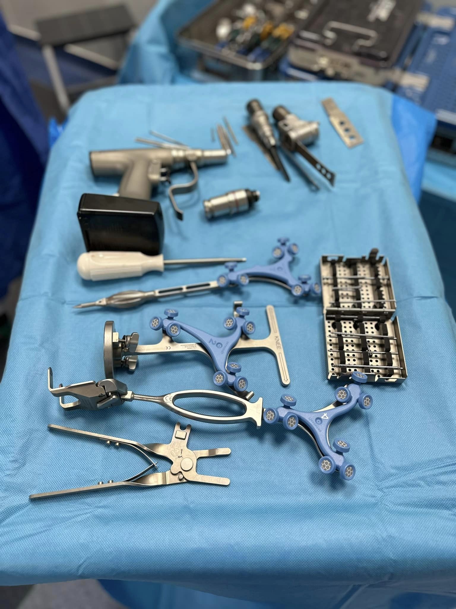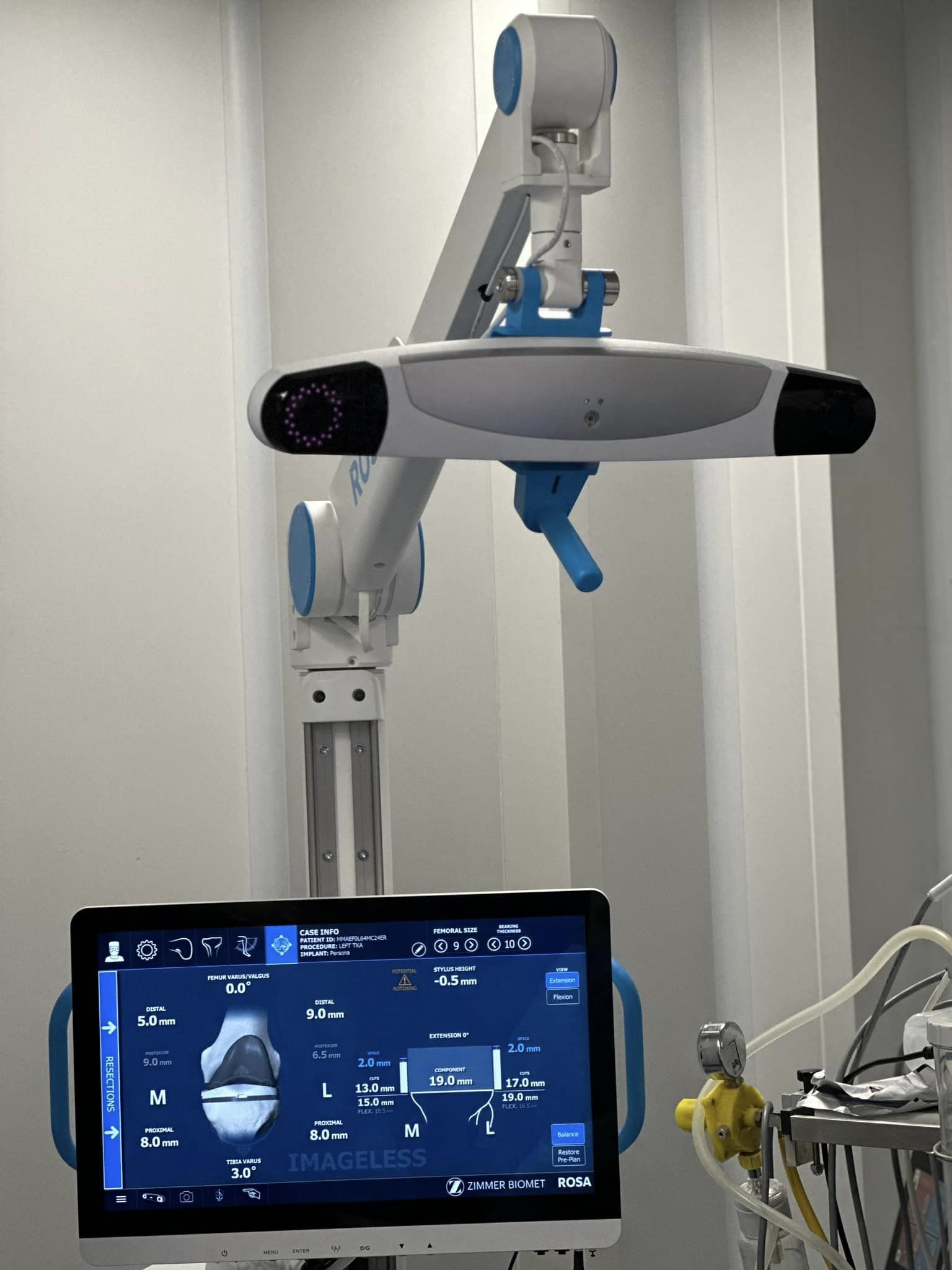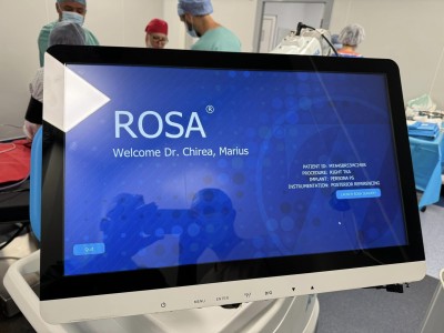Lucrăm cu robotul ROSA de la Zimmer Biomet care prin sistemul său de navigație intraoperatorie și brațul robotic de mare precizie ne ajută să implantăm proteza de genunchi cu precizie de jumătate de milimetru și rotații de jumătate de grad. În modul convențional, clasic, de protezare a genunchiului pot apărea mici abateri de la planingul preoperator pe care ochiul uman nu le poate sesiza, lucruri care se răsfrâng în rezultatul postoperator și durata de viață a protezei. Pe lângă chirurgia de mare precizie, protezarea robotică a genunchiului reduce foarte mult pierderile osoase, reduce riscul de trombembolie prin faptul că nu mai este necesară deschiderea canalului femural și tibial, în acest fel reduce pierderea de sânge și ne permite realizarea unui aliniament kinematic al genunchiului”.