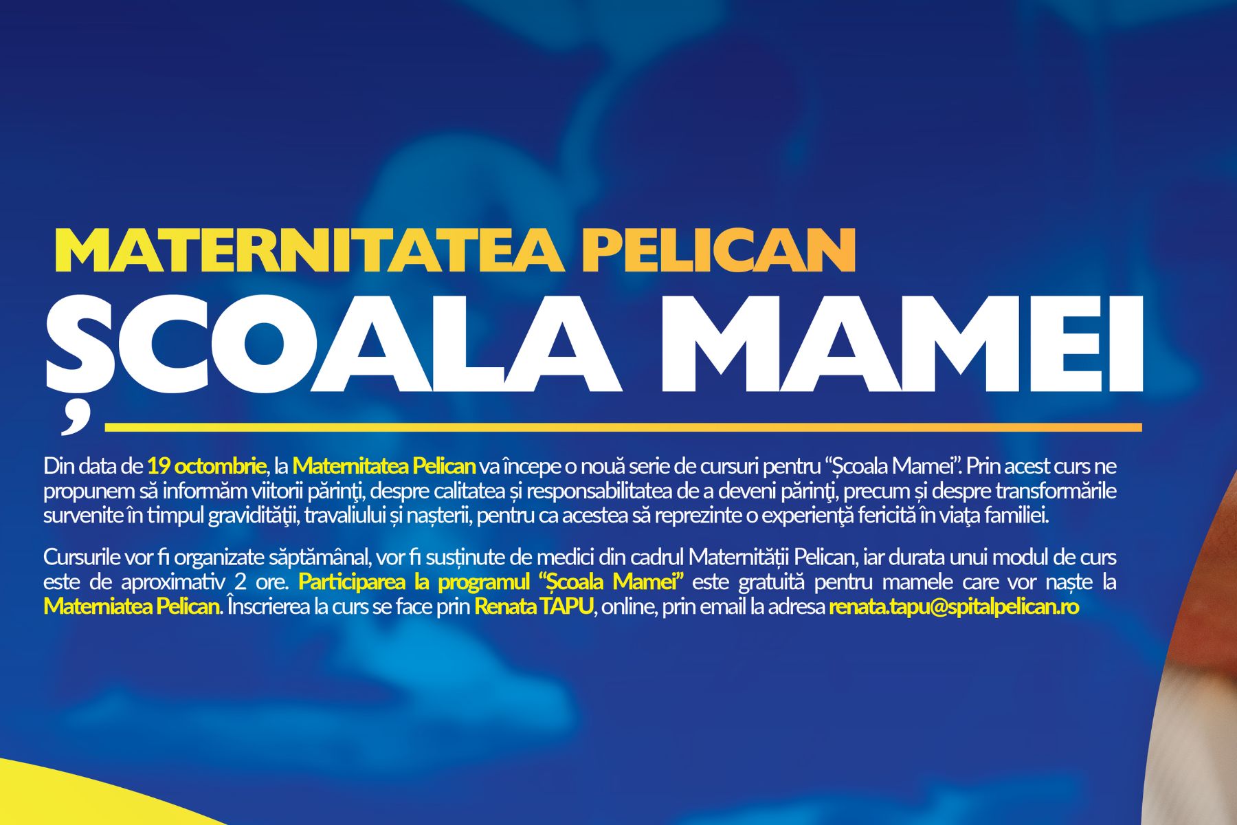 Incepand cu 24 octombrie 2017, la Maternitatea Pelican va incepe un nou curs pentru "Scoala Mamei"....