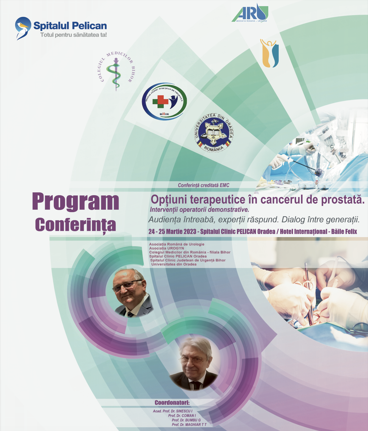 In perioada 24-25 martie Spitalul Pelican in colaborare cu Spitalul Judetean de Urgenta va fi gazda Conferintei de Urologie, coordonata de prof. univ. dr. Teodor Maghiar, director medical al Spitalului Pelican si prof. dr. Gheorghe Bumbu. Acest eveniment face parte din preocuparile permanente ale Asociatiei Romane de Urologie, sub coordonarea Academician prof. univ. dr. Ioanel Sinescu, de a descoperi in timp util cancerul de prostata si mai ales de a gasi variantele terapeutice potrivite pacientilor nostri.