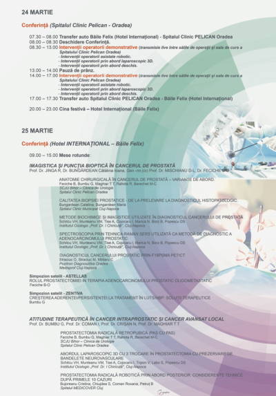 Programul cuprinde interventii chirurgicale deschise, laparoscopice si robotice la pacienti diagnosticati cu cancer de prostata, care se vor efectua vineri incepand cu ora 9:00 la Spitalul Pelican, urmate de mese rotunde cu tematici legate de diagnosticul si tratamentul cancerului de prostata localizat si avansat, la Hotel International din Baile Felix, incepand cu ora 9:00, in cea de-a doua zi a conferintei.