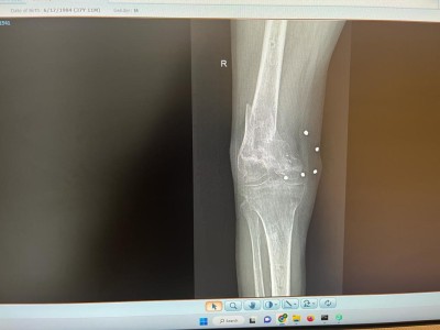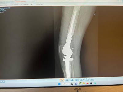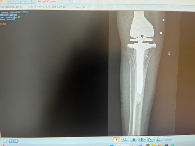 "Defectul osos mare de la nivelul femurului distal impun o reconstructie a genunchiului cu endoproteza segmentara pentru defect femural mare pe care impreuna cu echipa mea (dr. COSTE REMUS, dr. DRAGHICIOIU HOREA, dr. MUBARAK FADOL, as. GAVRA MONICA) am efectuat-o in luna iunie 2022. Lipsa mare de os de la nivelul femurului distal am inlocuit-o cu un sistem GMRS Stryker.