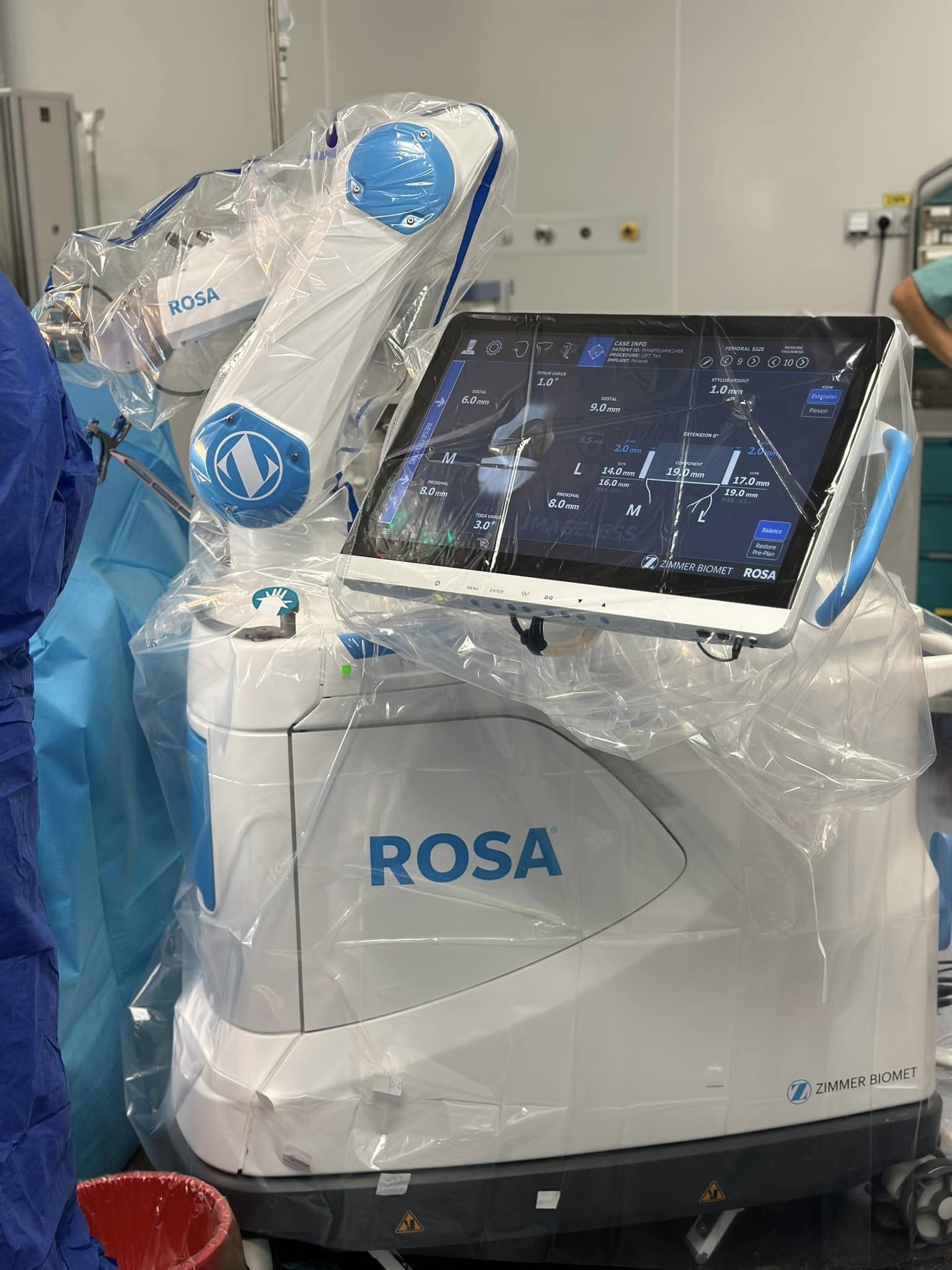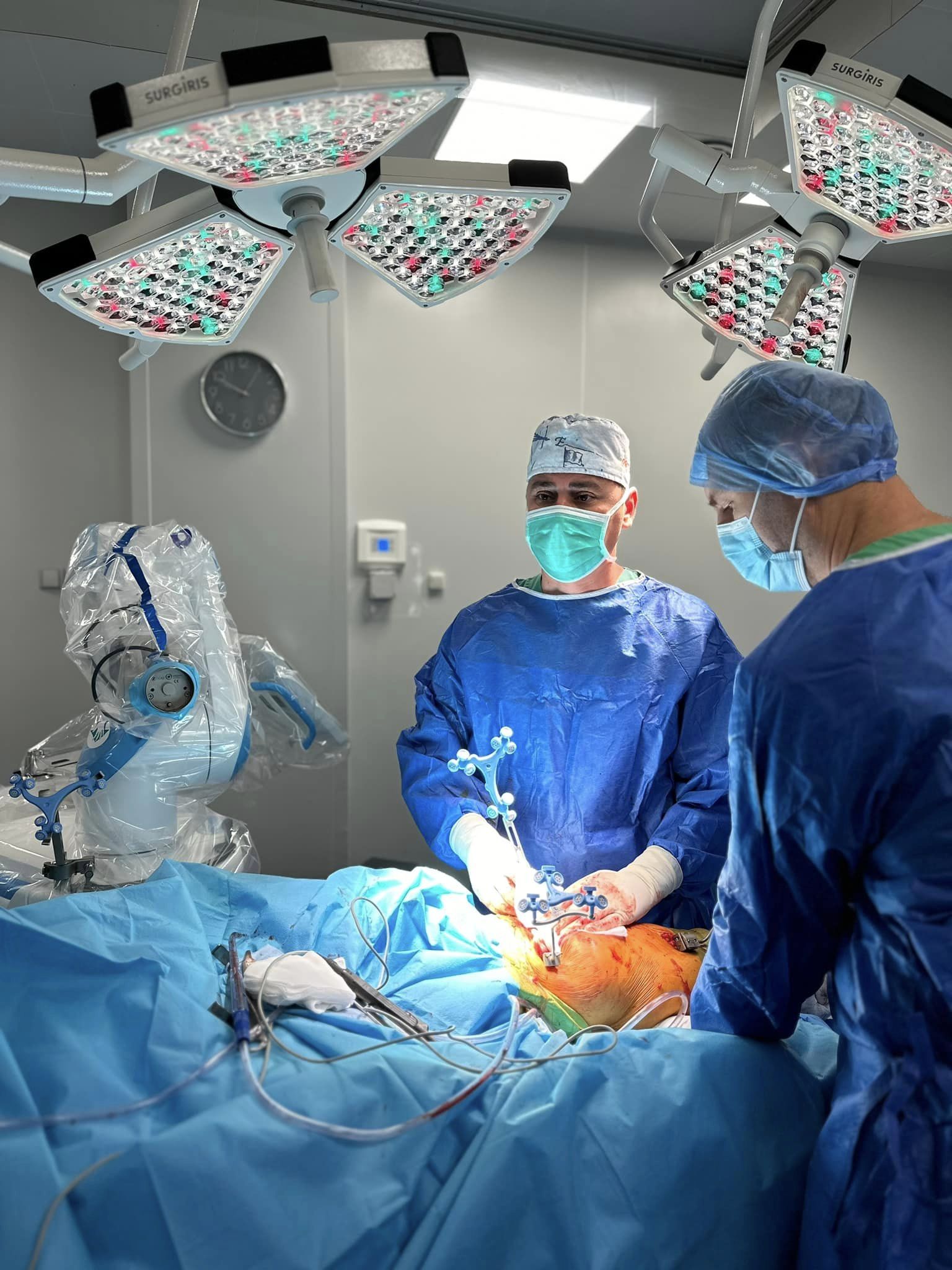 Lucrăm cu robotul ROSA de la Zimmer Biomet care prin sistemul său de navigație intraoperatorie și brațul robotic de mare precizie ne ajută să implantăm proteza de genunchi cu precizie de jumătate de milimetru și rotații de jumătate de grad. În modul convențional, clasic, de protezare a genunchiului pot apărea mici abateri de la planingul preoperator pe care ochiul uman nu le poate sesiza, lucruri care se răsfrâng în rezultatul postoperator și durata de viață a protezei. Pe lângă chirurgia de mare precizie, protezarea robotică a genunchiului reduce foarte mult pierderile osoase, reduce riscul de trombembolie prin faptul că nu mai este necesară deschiderea canalului femural și tibial, în acest fel reduce pierderea de sânge și ne permite realizarea unui aliniament kinematic al genunchiului”.